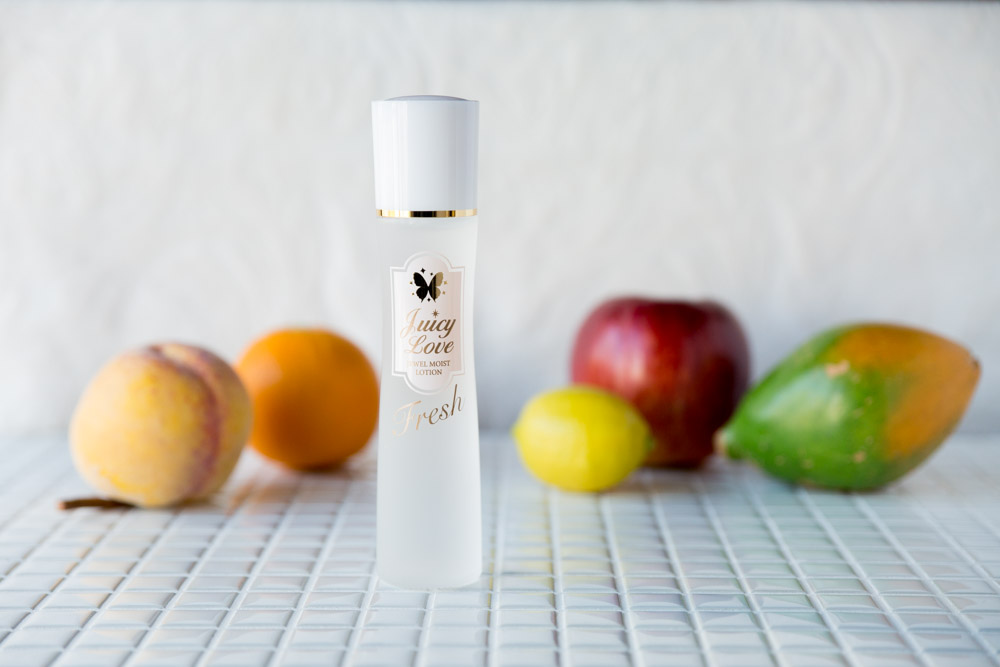 蝶々JUICY LOVEのコンセプトは果実の新鮮さや潤いなど、酵素の力が凝縮して入っているところ。つまりフルーツの力が元からのコンセプトなのです。フレッシュシリーズは、その果実成分にプラスして、酵母が結集して更にハイパーにお肌の内部に働くようになりました。
