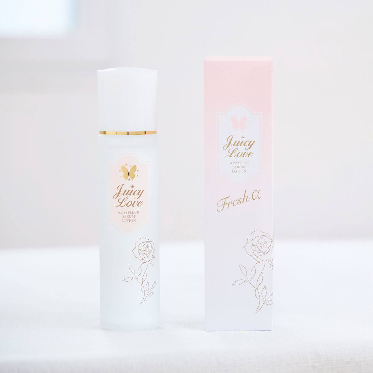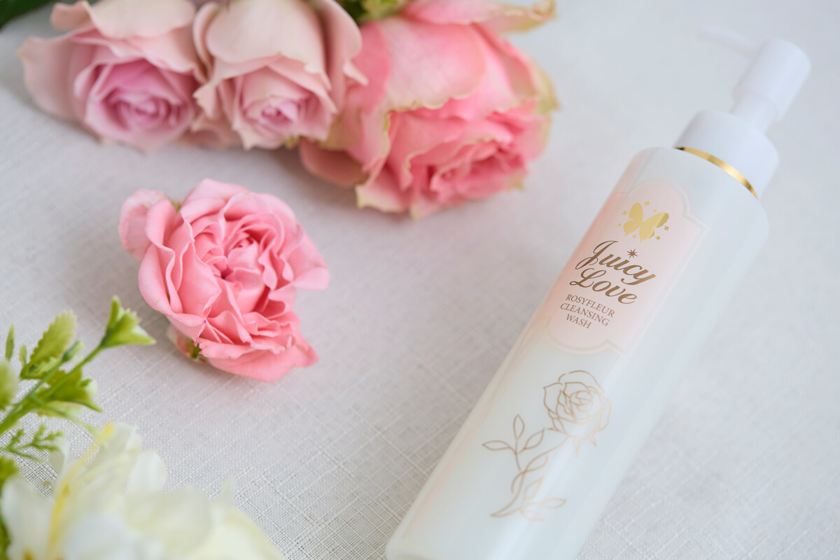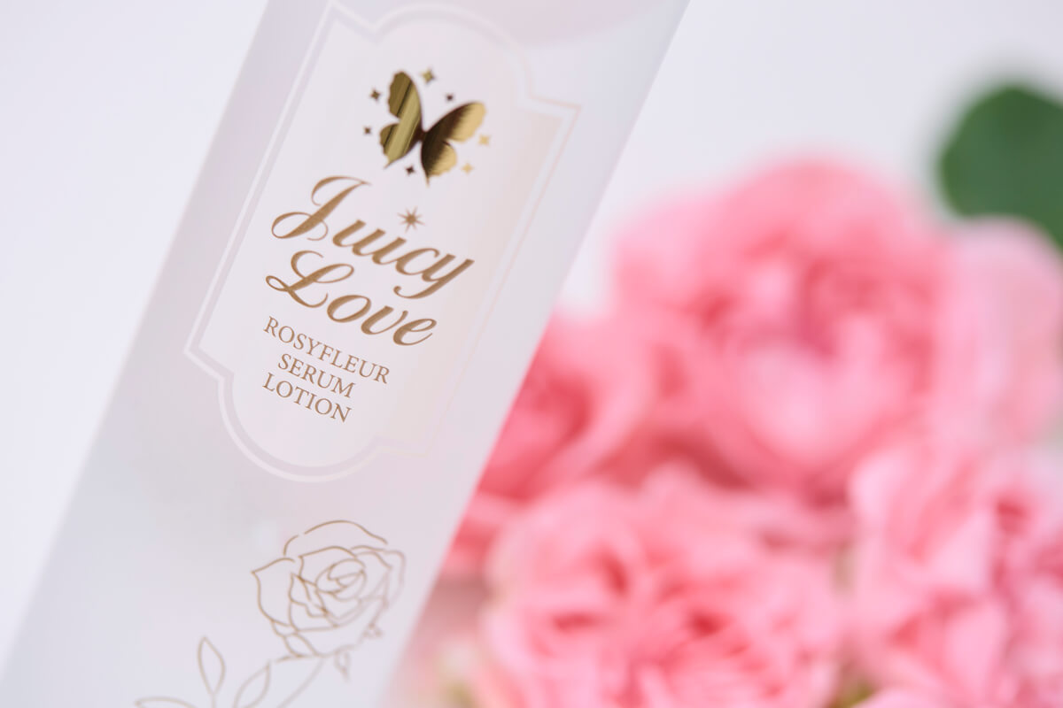蝶々ジューシィラブシリーズならではの、<きめ細やかで透明感のある世界観>は継続しつつ、ロージィフルールを象徴する、バラのエレガントで豊かな美のパワーを加えてほしいというリクエストに、担当デザイナーの金森氏が素敵にこたえてくださいました。 本当に美しいパッケージで、使う前からうっとりしてました。毎日使うものだから、パッケージから楽しんでいただけたら嬉しいです。